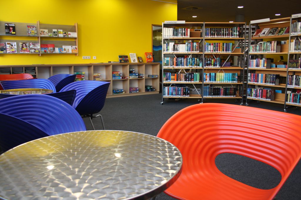 - Wo wurde dieses Foto aufgenommen? Fotografiert das Bild nach. - Es wurde in der Jugendbibliothek aufgenommen. Blick Richtung Infotheke.